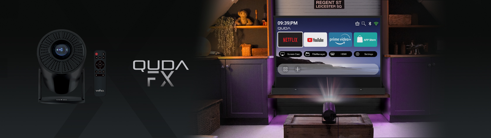 The Veho Quda FX smart projector is a home cinema in a pocket. The Quda FX uses Android 11.0 operating system for a smoother, faster experience with built-in streaming apps such as Netflix, YouTube & AirPin/Miracast (Android) casting apps to cast from a smartphone or tablet. Watch movies in Full HD 1080p and 4K supported playback, Wi-Fi 6 ensures an easy, fast connection. It also features a built-in HDMI input port which is suitable for TV Stick, game consoles, PCs, smartphones, laptops, DVD players, and USB sticks etc (check for compatibility with your HDMI device). Includes carry bag and multi-regional mains plugs for international travel.